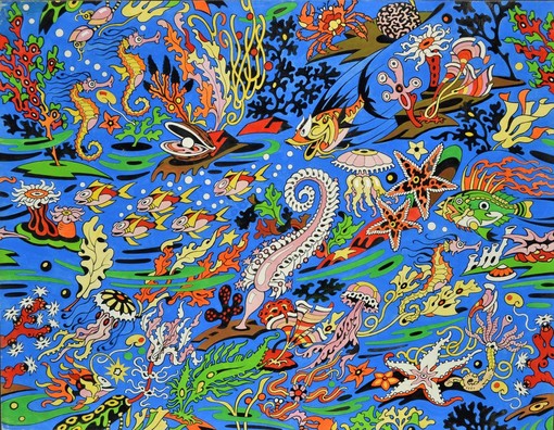 L’artista sanremese Antonio Rubino è raccontato attraverso i disegni che hanno reso unica la sua produzione artistica: pesci, anemoni e stelle marine sono colorati e decorati con granelli perlescenti per ricreare il luccichio del mare. I singoli pesci, nati da un lavoro individuale, vengono poi incollati su una grande superficie blu. Nasce così un’opera collettiva, estremamente variegata nella scelta delle forme e dei colori.
