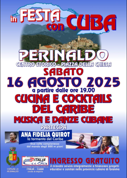 Sabato 16 agosto 2025, l'associazione di Amicizia Italia-Cuba (circolo di Imperia) organizza a Perinaldo la 'Festa per Cuba'.