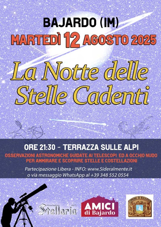 Si tramanda da tempi antichi che osservare le stelle cadenti, esprimendo un desiderio, possa favorirne la realizzazione. E Bajardo, con la sua posizione privilegiata e il fascino sospeso tra cielo e terra, è il luogo ideale per provarci. L’appuntamento è per martedì 12 agosto alle ore 21.30, nella parte alta del borgo, nota come Terrazza sulle Alpi: uno scenario mozzafiato, lontano dalle luci della città, perfetto per immergersi nel buio e lasciarsi incantare dal firmamento.