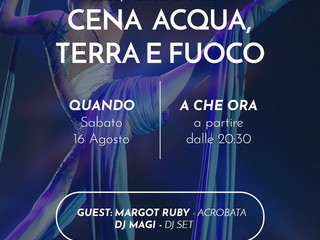 - 16/8 con Acqua, terra e fuoco con un’artista francese che realizzerà uno spettacolo, durante la cena con i tre elementi e a seguire dj set