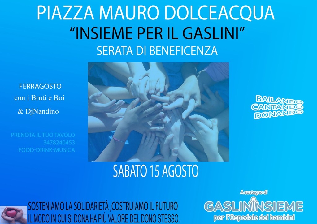 Una serata di beneficenza a sostegno di Gaslininsieme per l'ospedale dei bambini verrà proposta a Dolceacqua. "Insieme per il Gaslini" si terrà sabato 15 agosto in piazza Mauro.