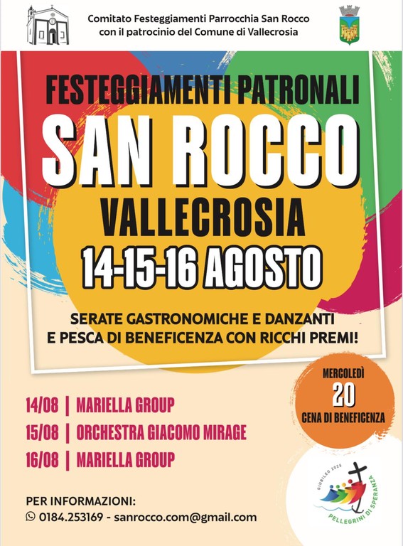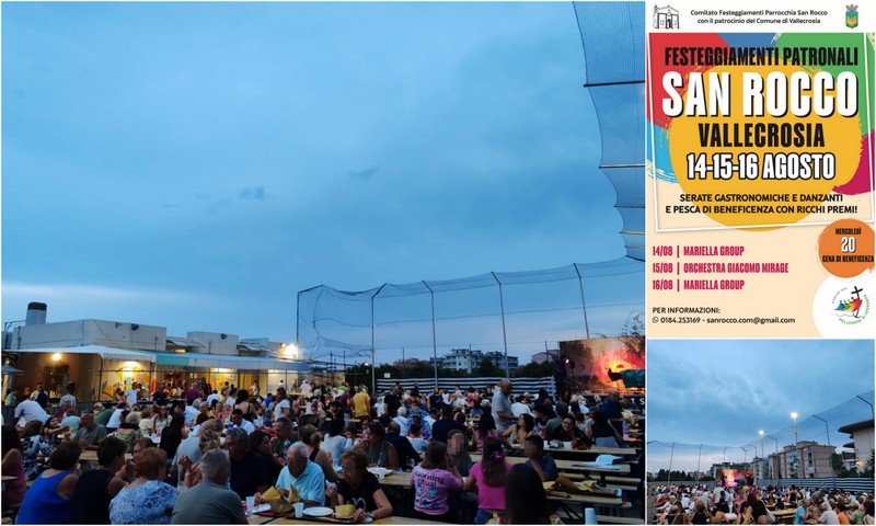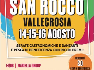 Il festino, organizzato dal Comitato Festeggiamenti di San Rocco con il patrocinio del comune di Vallecrosia, tornerà anche questa sera, il 15 agosto, e domani sera, il 16 agosto, dalle 19.30 per celebrare il Ferragosto e il santo patrono della città della famiglia. Ad animare la serata di oggi vi sarà l'Orchestra Giacomo Mirage mentre il 16 agosto, giorno di San Rocco, tornerà Mariella Group. Il ricavato del festino verrà devoluto alla parrocchia e quest'anno sarà destinato per il fotovoltaico.