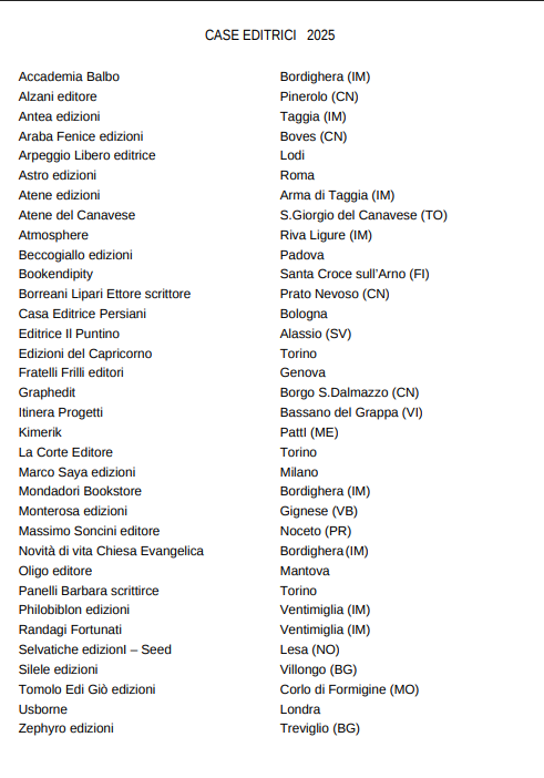 "Da sempre il BBF è attento alle realtà locali e alla promozione del territorio" - sottolinea Savella - "Giovedì 28 agosto alle 17 nel salotto Antea Annamaria Acquista e Maria Maddalena Garibaldi presenteranno 'La ragazza del bergamotto'; venerdì 29 agosto alle 18 nel salotto Antea Fabrizio Vignolini illustrerà 'La varietà dell'olivo e la produzione olearia nel Ponente Ligure'; sabato 30 agosto alle 10,30 nel salotto Antea Marco Damele parlerà di 'Liguria selvatica'. Al termine della presentazione partirà una passeggiata botanica con l'autore. Alle 16.45, invece, al Buga Buga Bernardino Veneziano farà conoscere 'Le Chiese delle frazioni di Ventimiglia'; nel Salotto Antea alle 17 Loredana Crivellari presenterà 'Gesù dorme nel mio garage'; Maria Gabriella Tucillo 'Vita di mare' mentre alle 21 il giornalista Stefano Delfino parlerà di 'Quel profumo di mandarini'. Domenica 31 agosto alle 10 nel salotto Antea Marco Damele illustrerà 'Il respiro dei fiori' mentre alle 17,15 nel salotto Antea Marco Alberti parlerà di 'Flora e vegetazione della Liguria'. Come ogni anno il Bordighera Book Festival ospita l'Accademia Balbo; la mostra 2025 'Libro d'artista' e il Gattile di Ventimiglia con le volontarie dei 'Randagi Fortunati'".
