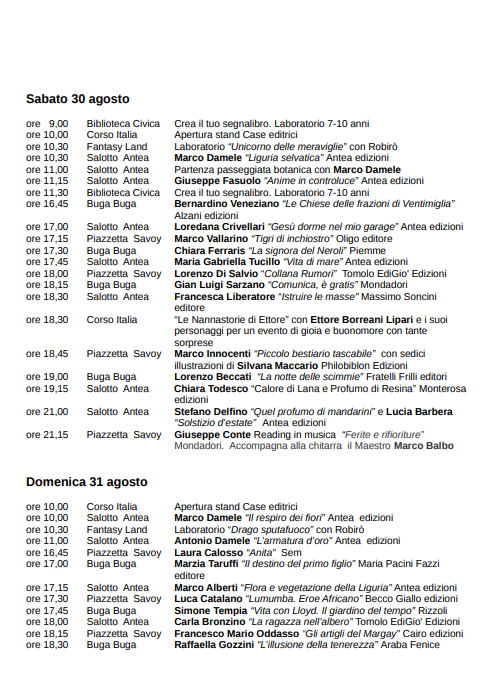La manifestazione inizierà giovedì 28 agosto alle 16.30 con l'inaugurazione ufficiale e l'apertura degli stand delle case editrici. “Siamo felici di accogliere la nuova edizione del Bordighera Book Festival, l'evento che nell'ultimo fine settimana di agosto trasforma Bordighera nella 'città del libro', e di rinnovare un sodalizio di successo, nato nel 2014" - dichiara Vittorio Ingenito, sindaco della città di Bordighera - "Caffè letterari, incontri con gli autori, stand delle case editrici, laboratori per i più piccoli: ogni proposta mette al centro il piacere della lettura e la sua capacità di aprire orizzonti nuovi di crescita e di conoscenza, in tutti i campi. Una funzione insieme ricreativa e formativa, che questa Amministrazione ha promosso e continua a promuovere con convinzione attraverso tante iniziative, tra cui spicca il Bordighera Book Festival, che sono valse la riconferma della qualifica di 'Città che legge'. La manifestazione si svolgerà in corso Italia dove verranno radunate case editrici provenienti da tutto il territorio italiano, per proporre le nuove proposte editoriali. Un sincero ringraziamento va a Paola Savella di Espansione Eventi, e a Donatella Tralci del Mondadori Bookstore per la capacità di rinnovare ogni anno uno degli appuntamenti più importanti che animano Bordighera alla fine di agosto e a tutti coloro che collaborano a questo grande evento nel segno del libro, della lettura e della cultura. C'è, per il futuro, un progetto per allargare la manifestazione. Stiamo pensando o di trovare un posto diverso o aggiungere qualche giornata in più".