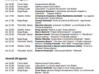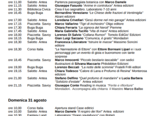 E' un evento gratuito aperto a tutti, sia per gli appassionati di libri che scoprono fra le novità delle case editrici, provenienti da tutto il territorio nazionale, curiosità e libri difficilmente reperibili in libreria sia per i curiosi che si potranno aggirare fra gli stand espositivi nel centro cittadino riscoprendo la cultura in “strada”. Nel programma sono previsti anche reading di lettura, incontri con personaggi per bambini, mostre, laboratori, animazione e una passeggiata. "Uno spazio sarà dedicato ai bambini. Quest'anno vi sarà Fantasy land, per quattro giorni i bimbi saranno catapultati in un mondo fantastico a cura di Rondò Small Lab per Delfi Asd: giovedì 28 dalle 16.30 alle 19.30 vi sarà il laboratorio 'Lo gnomo dei boschi!', venerdì 29 agosto dalle 10,30 alle 12,30 e dalle 16,30 alle 19.30 il laboratorio 'La Sirena degli abissi'; sabato 30 agosto dalle 10.30 alle 16.30 alle 19.39 il laboratorio 'Unicorno delle meraviglie' e, infine, domenica 31 agosto il laboratorio 'Il respiro dei fiori'. Un incontro particolare verrà proposto sabato pomeriggio alle 18.30 in corso Italia. Il dodicenne Ettore Borreani Lipari presenterà 'Le nannastorie di Ettore'".