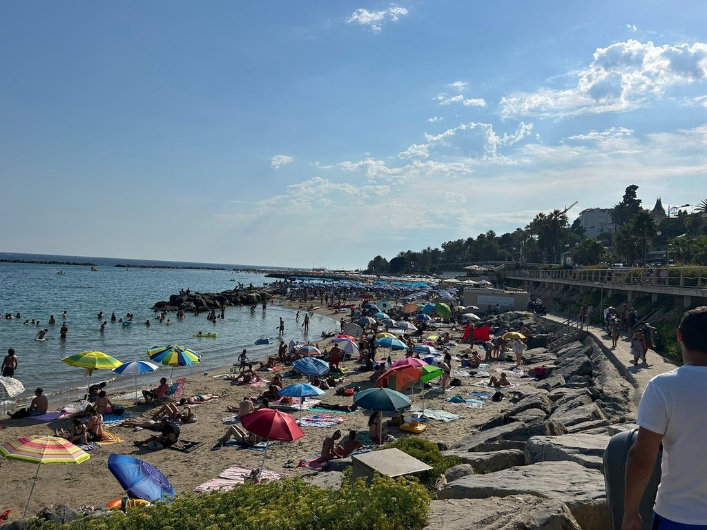 Il caldo opprimente ha avuto un riflesso immediato anche sulla vita balneare: nei giorni centrali della settimana le spiagge di Sanremo sono state letteralmente prese d’assalto, con un numero di persone in acqua superiore a quelle rimaste sotto gli ombrelloni. Tra tuffi, giochi e lunghe nuotate, ognuno ha cercato di rinfrescarsi come ha potuto, trasformando il mare in un rifugio naturale contro l’afa.