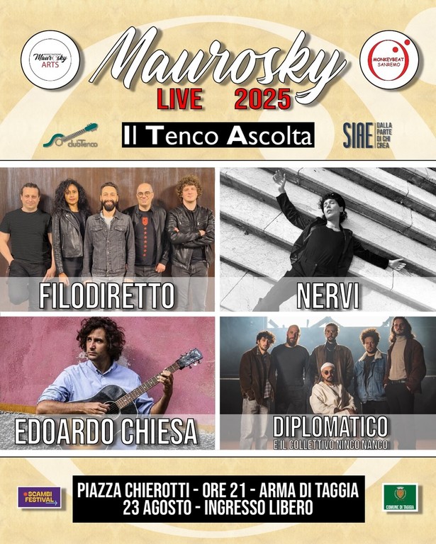 Sabato 23 agosto 2025 alle ore 21:00 in Piazza Chierotti ad Arma di Taggia (IMPERIA) l’associazione Maurosky Arts, patrocinata dal Comune di Taggia, presenta la terza edizione del festival musicale MAUROSKY LIVE, nato nel 2021 in memoria di Mauro Martini, artista poliedrico, pittore, fotografo e appassionato di musica, nonché fondatore dello studio Monkey Beat Sanremo e scomparso prematuramente nel 2020. Il Maurosky Live quest’anno vanta una prestigiosa collaborazione col Club Tenco col suo format alla scoperta di nuovi talenti IL TENCO ASCOLTA.