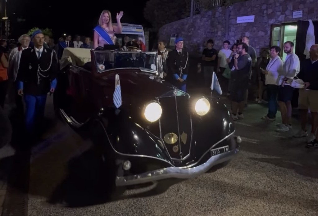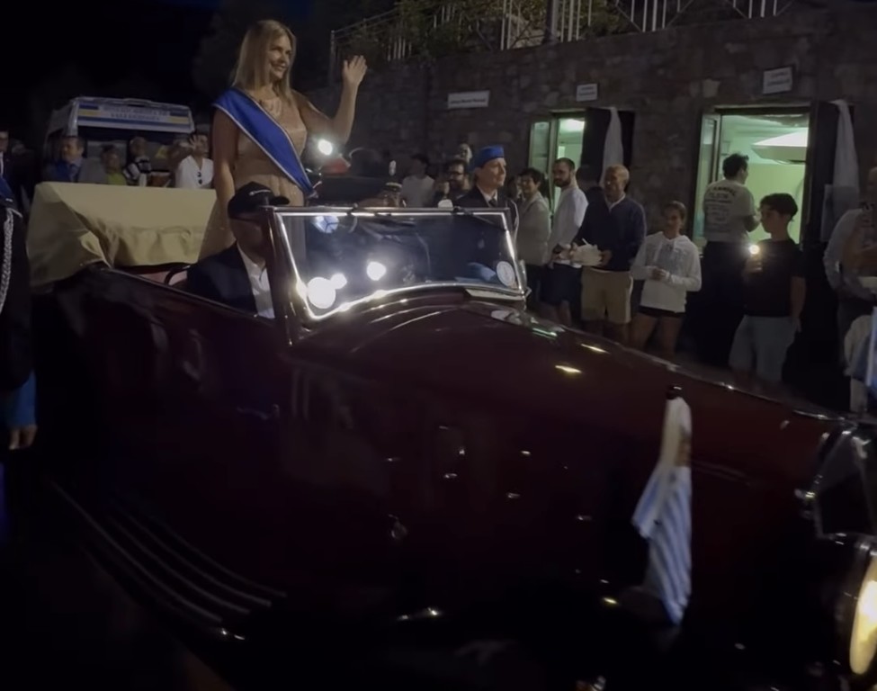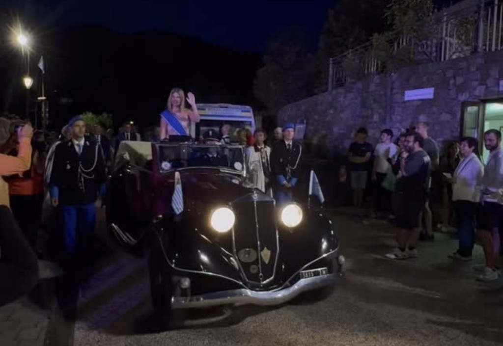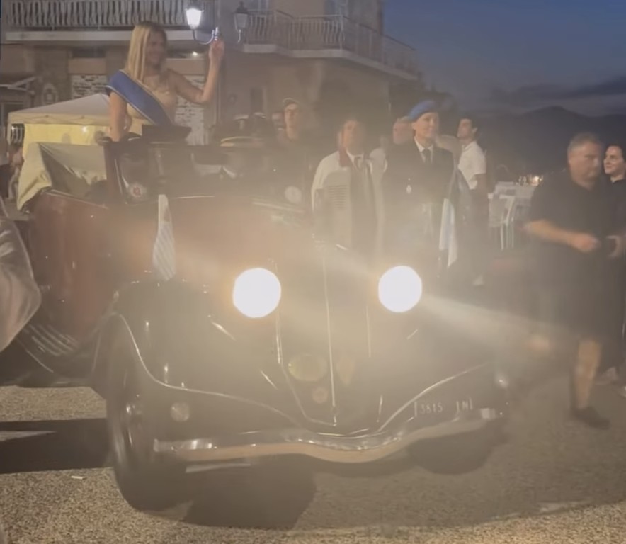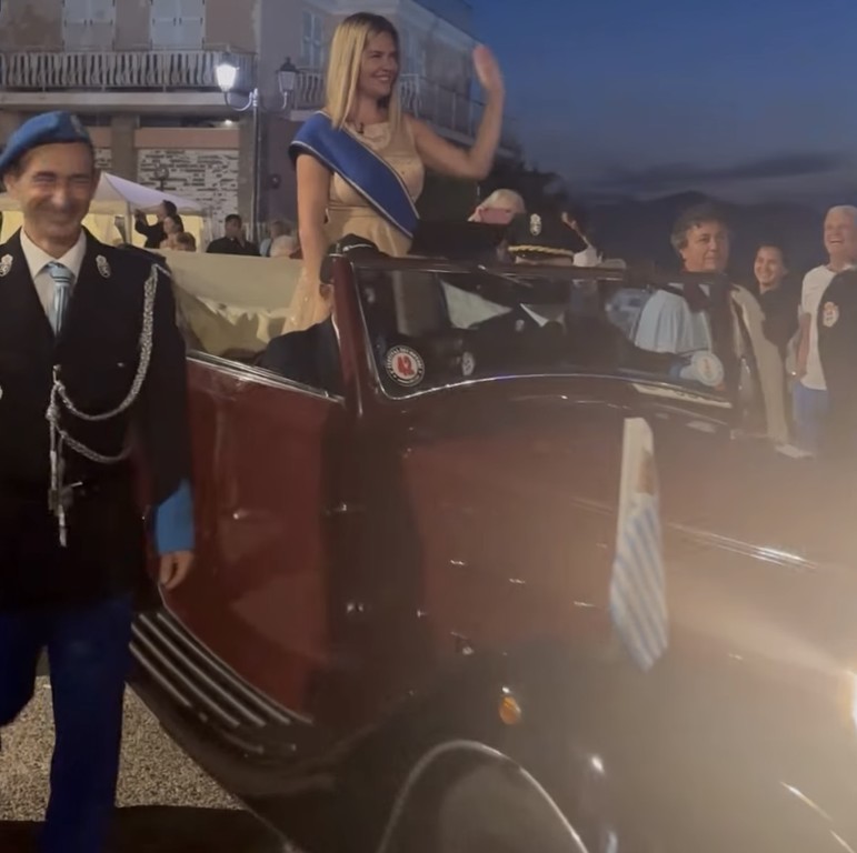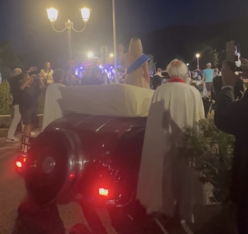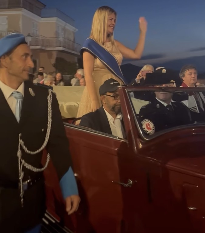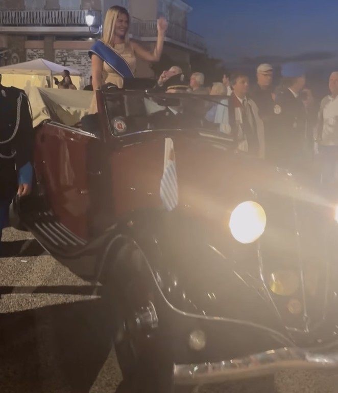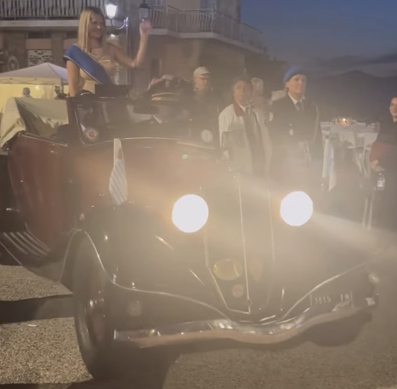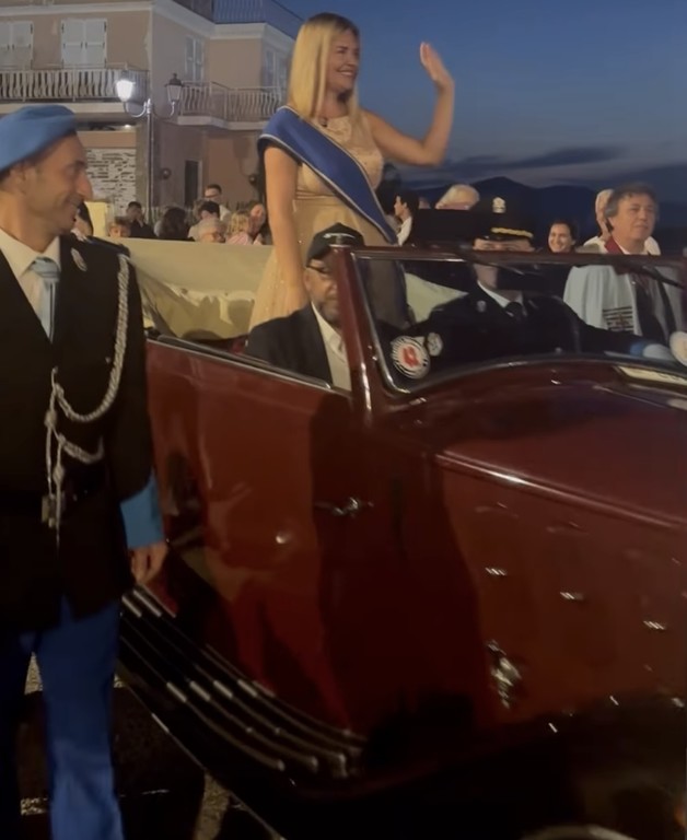 "Verso le 21, la principessa Nina ha fatto il suo ingresso in piazza a bordo di una splendida Lancia Artena Cabriolet Garavini del 1934 con tanto di 'bandierine diplomatiche'” tipiche delle auto dei capi di Stato. L’auto è stata gentilmente messa a disposizione dalla famiglia Lamberti-Rivella. Nel suo percorso verso la piazza la Principessa è stata scortata dai consiglieri della Corona, dai Priori, dalle Guardie, dai bambini del Mini Consiglio della Corona e dai figuranti del Sestiere Burgu di Ventimiglia con i loro abiti storici" - raccontano.