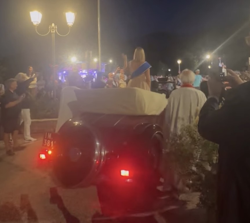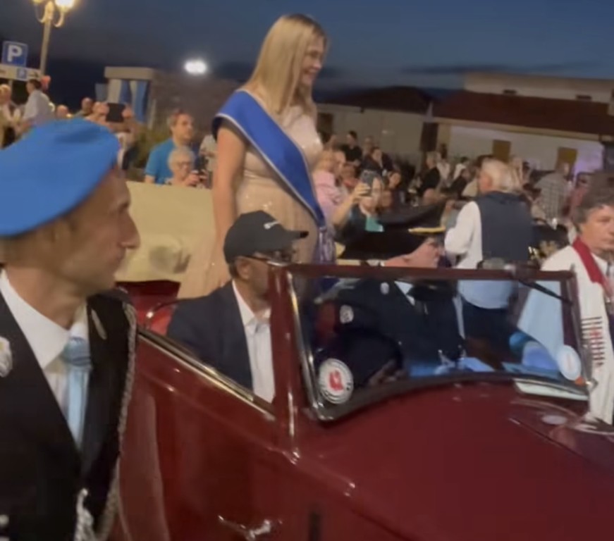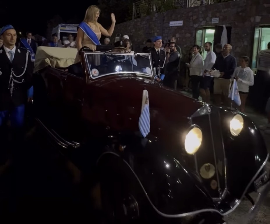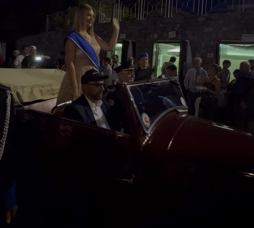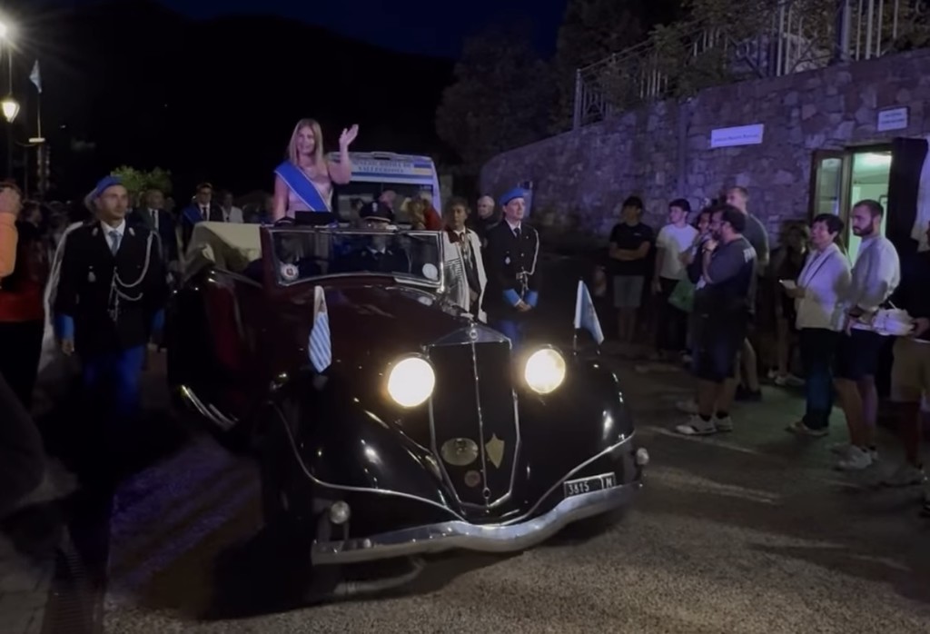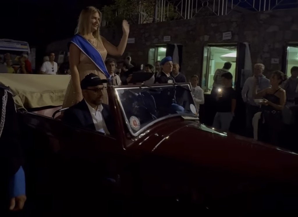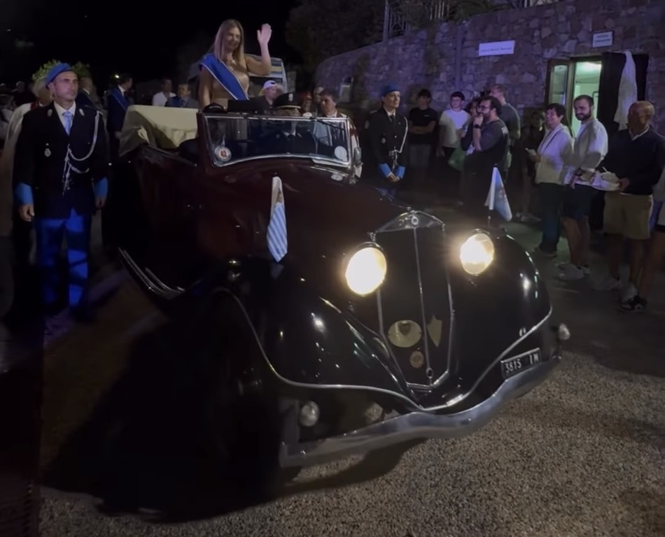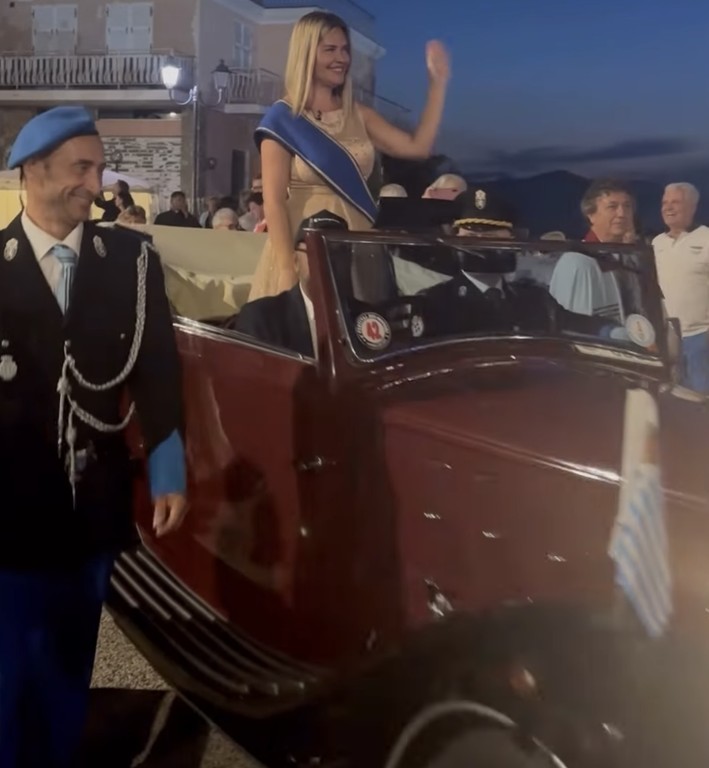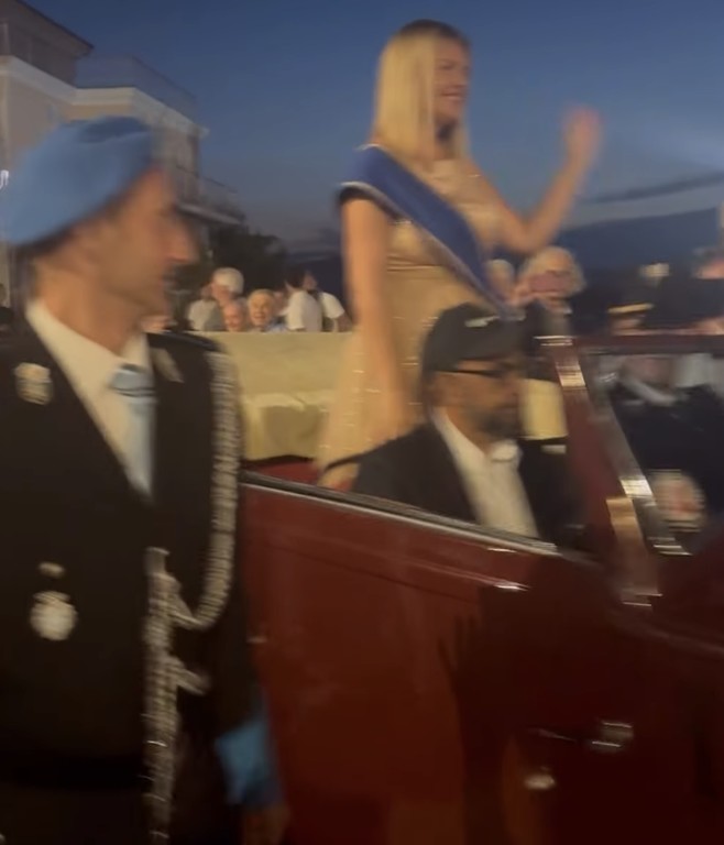 "Verso le 21, la principessa Nina ha fatto il suo ingresso in piazza a bordo di una splendida Lancia Artena Cabriolet Garavini del 1934 con tanto di 'bandierine diplomatiche'” tipiche delle auto dei capi di Stato. L’auto è stata gentilmente messa a disposizione dalla famiglia Lamberti-Rivella. Nel suo percorso verso la piazza la Principessa è stata scortata dai consiglieri della Corona, dai Priori, dalle Guardie, dai bambini del Mini Consiglio della Corona e dai figuranti del Sestiere Burgu di Ventimiglia con i loro abiti storici" - raccontano.