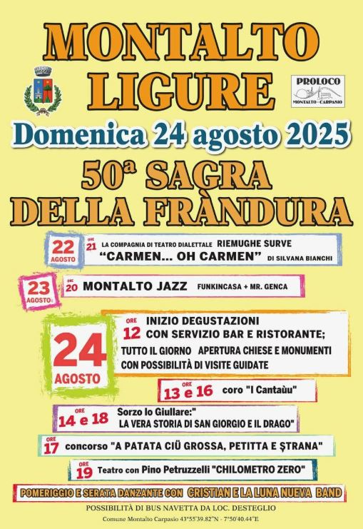 12.00. Sagra della Fràndura: inizio degustazioni con servizio bar e ristorante + tutto il giorno apertura chiese e monumenti con possibilità di visite guidate + spettacoli e animazioni + alle 17 Concorso ‘A patata ciù grossa, petitta e strana’ + alle 19 teatro con Pino Petruzzelli + pomeriggio e serata danzante con Cristian e la Luna Nuova Band. Possibilità di bus navetta dalla località di Desteglio (locandina)