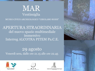 Il MAR di Ventimiglia apre oggi, venerdì 29 agosto, dalle ore 21.15 alle 22.45, le porte della nuova Sala Multimediale Immersiva al piano -1 del Forte dell'Annunziata realizzata grazie ai finanziamenti europei del progetto ALCOTRA IT-FR PITEM PA.C.E – Progetto “Semplice SALVAGUARDARE”.