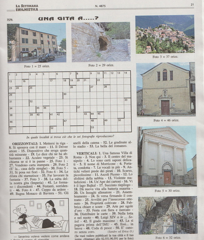 Ottima pubblicità per il borgo medievale di Triora. Non si tratta questa volta di streghe o diavoli, bensì de 'La settimana enigmistica', storica ed inimitabile rivista dedicata agli appassionati di parole crociate e rompicapi. Sul numero 4875 del 28 agosto, precisamente a pagina 21, quale “gita a…..” è stata infatti proposta Triora, con la pubblicazione a corredo di ben cinque fotografie, una delle quali, manco a dirlo, ritraente la Cabotina, ovvero la casa delle fattucchiere.