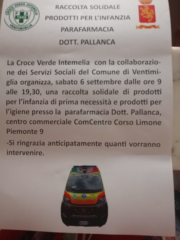 Un'iniziativa solidale proposta dalla Croce Verde Intemelia con la collaborazione dei Servizi sociali del Comune. "Vi aspettiamo sabato 6 settembre presso la parafarmacia del dottor Pallanca, al centro commerciale ComCentro in corso Limone Piemonte 9" - fanno sapere gli organizzatori.