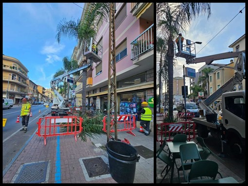 Sono iniziati, questa mattina, come previsto, i lavori di pulizia delle palme in via Colonnello Aprosio a Vallecrosia.
