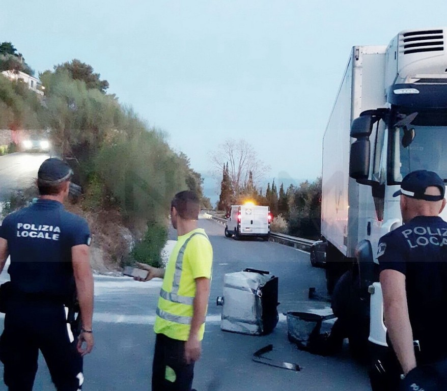Sanremo: camion incastrato sulla Rotabile Capo Nero, intervento di Vigili del Fuoco e Municipale (Foto)