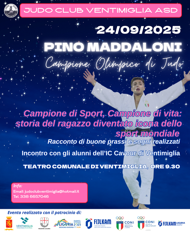 2) CULTURA: incontro con gli studenti dell’IC Cavour di Ventimiglia dal titolo "Pino Maddaloni, Campione di Sport, Campione di vita: storia del ragazzo diventato icona dello sport mondiale" – racconto di buone prassi e sogni realizzati.