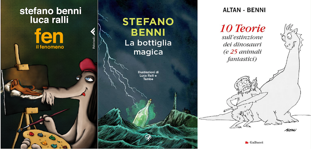 Le copertine dei volumi “Fen il Fenomeno”, “La Bottiglia Magica” e “10 teorie sull'estinzione dei dinosauri (e 25 animali fantastici)”