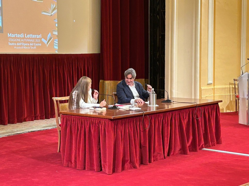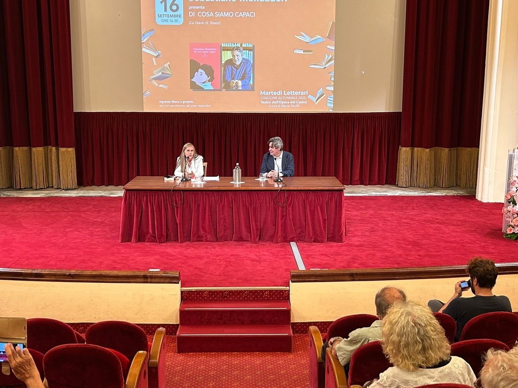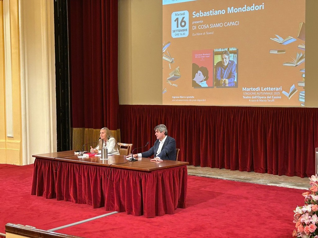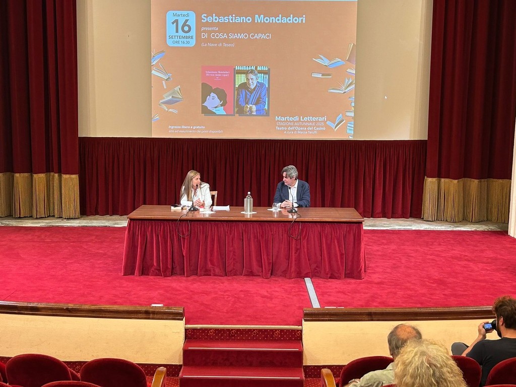 Il Teatro dell’Opera del Casinò di Sanremo ha accolto ieri pomeriggio Sebastiano Mondadori, protagonista del nuovo appuntamento con la stagione autunnale dei Martedì Letterari curati da Marzia Taruffi. Lo scrittore ha presentato il suo ultimo romanzo Di cosa siamo capaci (La Nave di Teseo), accompagnato dalle letture dell’attrice Loredana De Flaviis della compagnia “Il Teatro dell’Albero”.