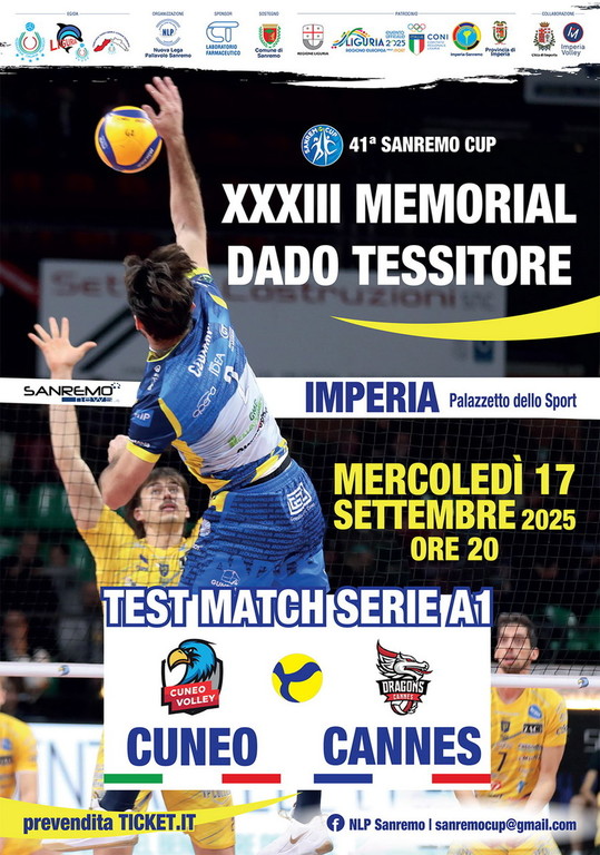 E’ annunciato il tutto esaurito, domani (mercoledì 17 settembre), al palazzetto dello sport di Imperia, dove andrà in scena la sfida di volley tra MA Acqua S. Bernardo Cuneo e Cannes, primo atto del Memorial Dado Tessitore. A pochi giorni dal trionfo azzurro nel Mondiale femminile e nel pieno della rassegna iridata maschile, grande è l’attesa per il confronto tra i piemontesi, tornati in Superlega dopo 11 stagioni, e i transalpini, da anni protagonisti della Ligue A. I biglietti sono andati letteralmente a ruba: l’ultima manciata è in prevendita online (tramite il portale www.ticket.it) e difficilmente se ne troveranno ancora al botteghino (inizio incontro alle ore 20, apertura impianto alle ore 19).