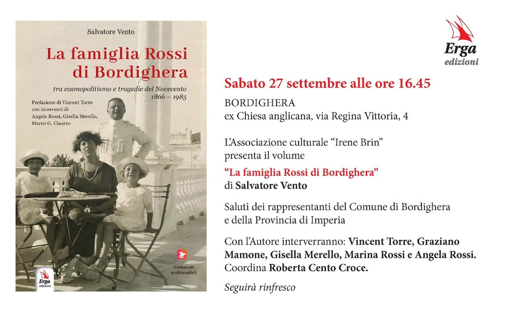 Una famiglia originaria di Sasso, frazione di Bordighera, è la protagonista della storia contemporanea d’Italia intitolata "La famiglia Rossi di Bordighera tra cosmopolitismo e tragedie del Novecento 1866-1985" scritta da Salvatore Vento. Il libro sarà presentato sabato 27 settembre alle 16.45 presso l’ex chiesa Anglicana a Bordighera.