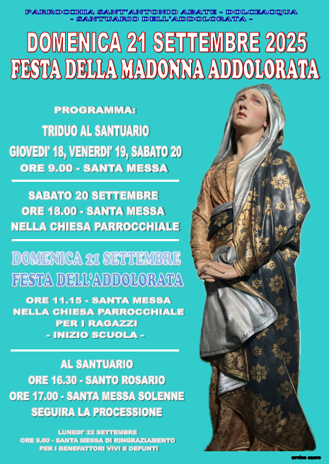 In preparazione alla festa della Madonna Addolorata è stato organizzato anche il Triduo al santuario. Iniziato questa mattina, giovedì 18 settembre, alle 9 con una santa messa, proseguirà anche venerdì 19 e sabato 20 settembre sempre con una santa messa alle 9, mentre sabato 20 alle 18 la santa messa sarà celebrata nella chiesa parrocchiale.