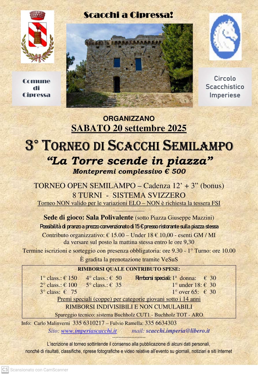 9.30. ‘La Torre scende in Piazza’: Torneo di scacchi semilampo in otto turni. Sala Polivalente (locandina)