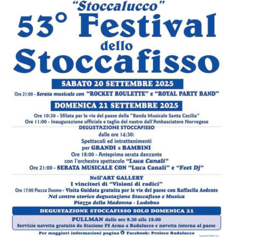 10.30. 53° Festival dello ‘Stoccafisso alla Baücögna’ a cura della Proloco di Badalucco con degustazione di numerose varianti di ricette di stoccafisso nelle piazzette del paese + bancarelle dell'artigianato + musica ed animazioni. Piazze e vie del paese (i dettagli nella locandina)