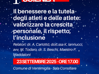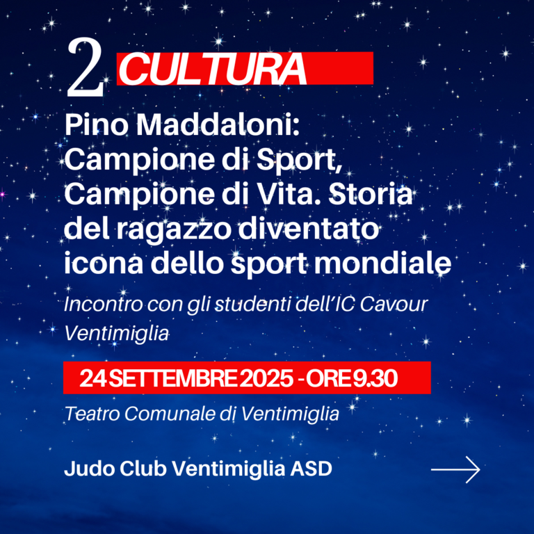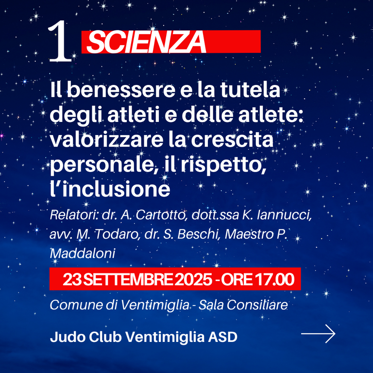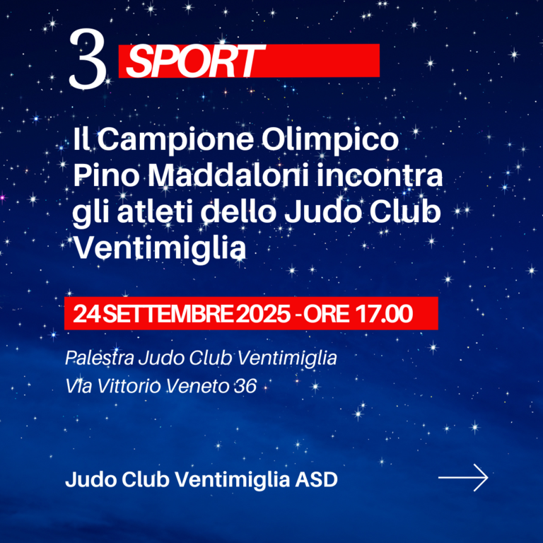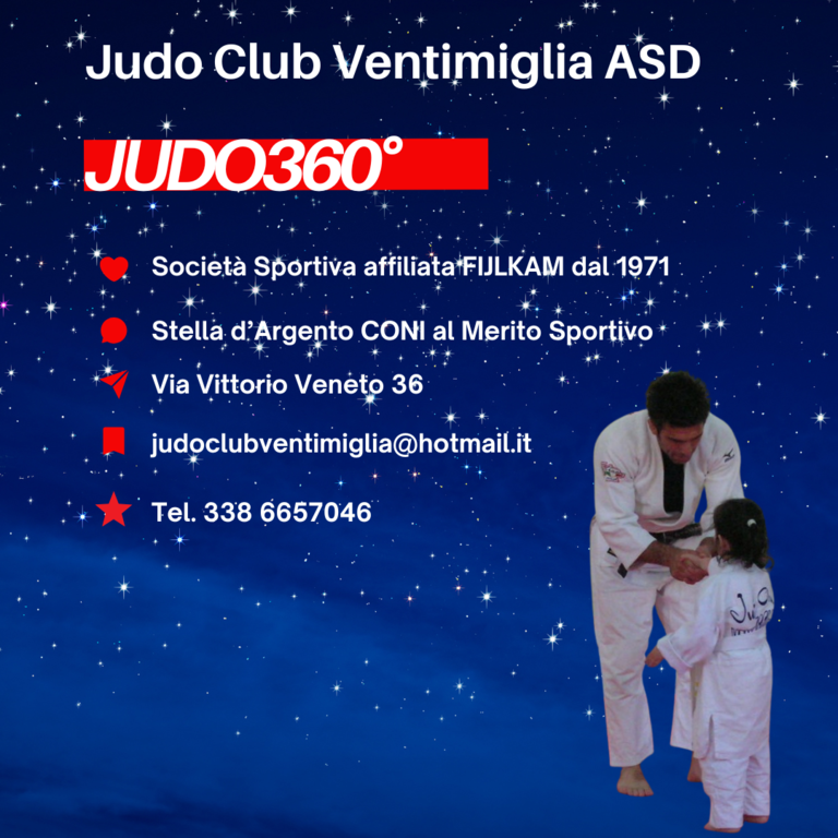 Una grande festa dedicata allo Sport e al Judo che si aprirà martedì 23 settembre alle ore 17.00 presso la Sala Consiliare del Comune di Ventimiglia con il workshop ‘Il Benessere e la Tutela degli Atleti e delle Atlete: valorizzare La Crescita Personale, il Rispetto, l’Inclusione’. La partecipazione al seminario è gratuita. È possibile iscriversi registrandosi al seguente link: https://bit.ly/iscizionejudo360workshop