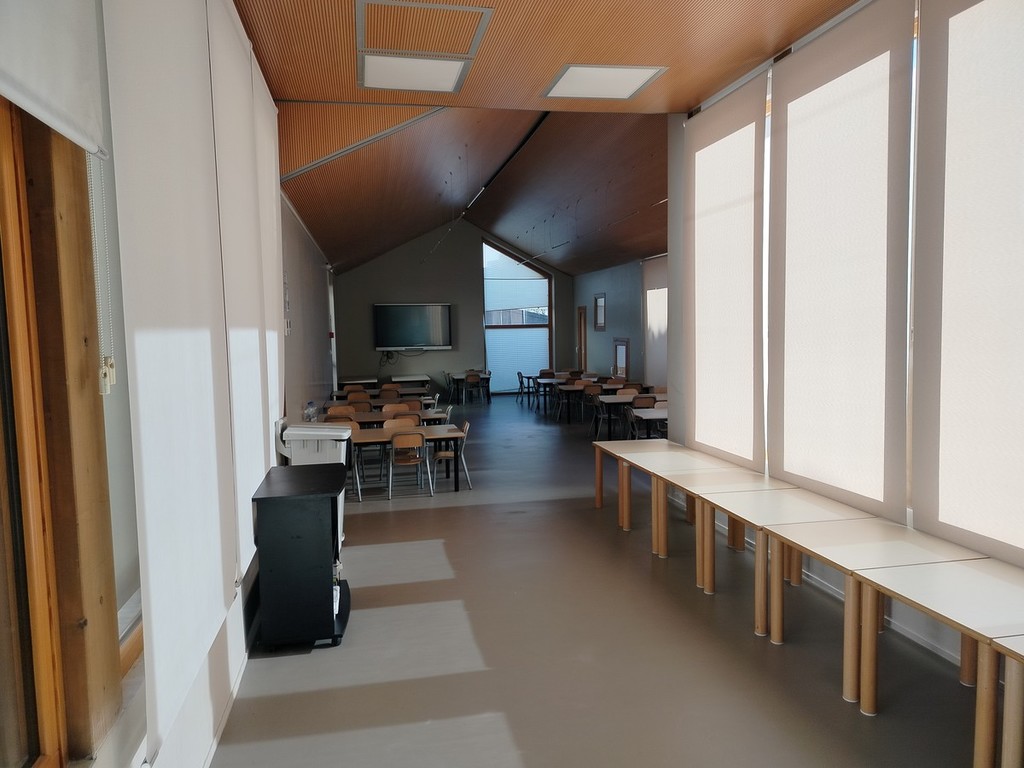 Il nuovo piano fuori terra si caratterizza in due volumi sfalsati dai prospetti intonacati e le finestre di dimensioni ed altezze da terra diverse. Insieme al tetto a due falde in acciaio color rame, l’immagine della nuova costruzione si colloca in continuità con quella del refettorio.