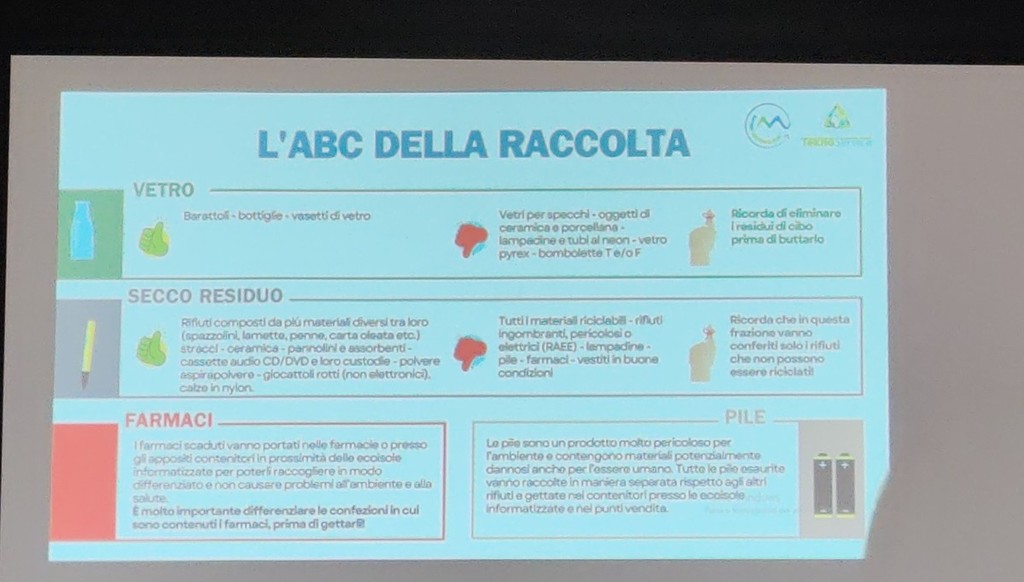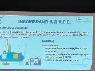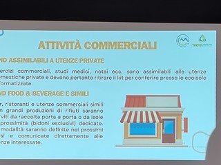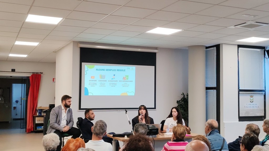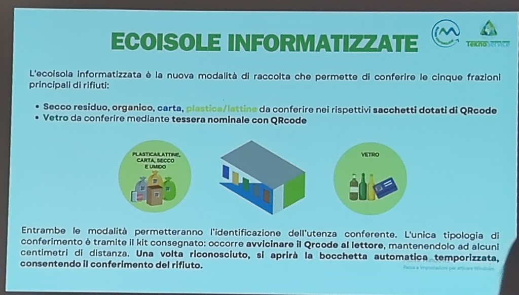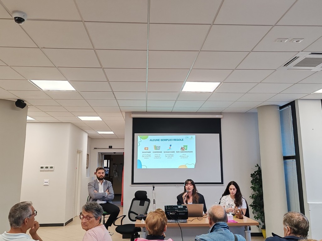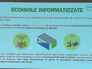 Il vicesindaco Cristian Quesada, il consigliere comunale Mattia Petrini e due rappresentanti di Teknoservice hanno illustrato alla folla di cittadini presenti l’uso corretto del nuovo sistema per il conferimento dei rifiuti differenziati. "Per utilizzare le ecoisole informatizzate basterà mostrare il codice Qr presente sul sacchetto o la tessera per quanto riguarda il vetro, che non avrà un sacchetto, e in automatico si aprirà la bocchetta giusta per conferire il rifiuto. Si avranno circa 30 secondi per poter buttare il sacchetto con i rifiuti" - viene spiegato durante l'incontro - "Un sacchetto sarà riservato alla carta e al cartone in cui si potranno conferire giornali, riviste, depliant, imballaggi di carta o cartoncino, scatole e scatoloni di cartone, confezioni in Tetrapak. Bisognerà ovviamente ridurre sempre il volume dei rifiuti prima di conferirli. Vi sarà poi un sacchetto per la plastica e metalli in cui si potranno conferire contenitori per liquidi, stoviglie in plastica, cellophane, contenitori alimentari in plastica, imballaggi in polistirolo, contenitori d'alluminio per alimenti, lattine, pellicola di alluminio e bombolette spray. Nell'organico, invece, vi andranno tutti gli scarti di cucina e avanzi di cibo, i fondi del caffè e di tè, la carta assorbente di cucina unta, fiori recisi e piante domestiche senza il terriccio, alimenti avariati, lettiera di piccoli animali domestici, ceneri spente, stuzzicadenti, stecchetti di legno e sughero in piccole quantità. Nel vetro si possono buttare barattoli, bottiglie e vasetti in vetro. Non vanno conferiti, però, i vetri degli specchi, gli oggetti di ceramica e porcellana,, le lampadine e tubi al neon, il vetro pyrex e bombolette T e/o F. Il secco residuo sarebbe l'indifferenziata, perciò, in questa categoria si devono conferire i rifiuti composti da più materiali diversi tra loro come spazzolini, lamette, penne, carta oleata, stracci, ceramica, pannolini, assorbenti, cassette audio, cd, dvd, custodie, polvere, giocattoli rotti e calze in nylon. I farmaci scaduti vanno portati nelle farmacie o presso gli appositi contenitori in prossimità delle ecoisole informatizzate. Le pile sono un prodotto molto pericoloso per l'ambiente e contengono materiali potenzialmente dannosi anche per l'essere umano e, perciò, vanno raccolte e gettate nei contenitori appositi".
