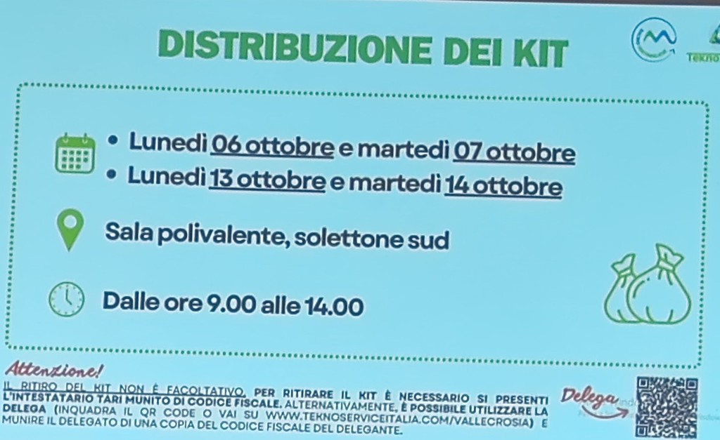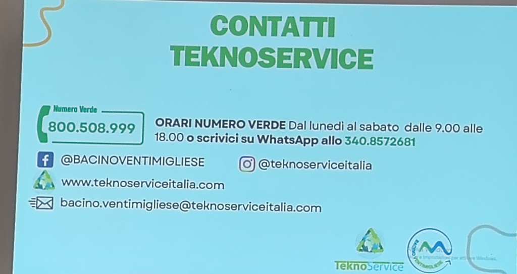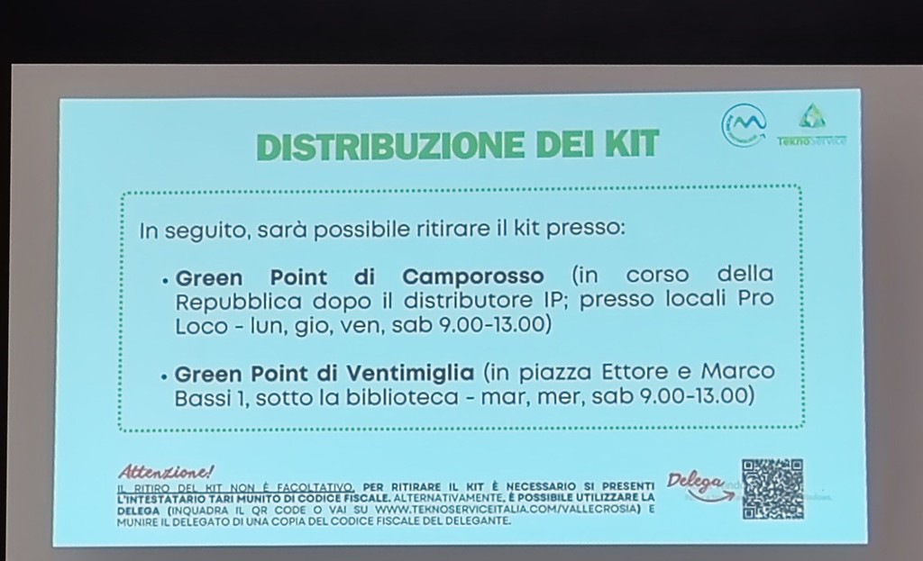 I prossimi appuntamenti informativi saranno domani sera, martedì 30 settembre, alle 18 e alle 20 presso la sala polivalente della città della famiglia. Sono, inoltre, previste giornate dedicate alla distribuzione gratuita dei kit dove i cittadini potranno ritirare i sacchetti con QR code per la raccolta differenziata, previsti per un anno, e la tessera nominativa per il vetro: il 6, il 7, il 13 e il 14 ottobre, dalle 9 alle 14, nella sala polivalente. "Il ritiro del kit è obbligatorio per poter accedere alle nuove postazioni informatizzate. Chi non riuscirà a ritirare il kit in queste date potrà farlo presso i punti di distribuzione: Green Point di Camporosso, in corso della Repubblica, o in quello di Ventimiglia, in piazza Bassi" - viene sottolineato durante l'incontro odierno - "Per il ritiro del kit sarà necessario presentarsi con il codice fiscale dell’intestatario Tari oppure con delega, che si può scaricare e compilare dal sito www.teknoserviceitalia.com/vallecrosia, e copia del documento del delegante. Per maggiori informazioni è possibile consultare il sito www.teknoserviceitalia.com, scrivere a bacino.ventimigliese@teknoserviceitalia.com, seguire la pagina Facebook @Bacinoventimigliese o contattare il numero verde 800.508.999, attivo dal lunedì al sabato, dalle 9 alle 18".