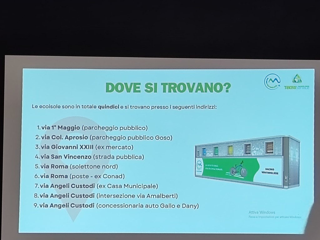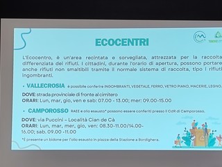 E' stata, inoltre, un'occasione per chiarire dubbi e rispondere alle tante domande poste dai cittadini. "Le ecoisole in totale saranno quindici e verranno collocate in via I Maggio, nei pressi del parcheggio pubblico, in via Col. Aprosio, nei pressi del parcheggio Goso, in via Giovanni XXIII, nei pressi dell'ex mercato, in via San Vincenzo, in via Roma, sul solettone nord e vicino alle Poste, in via Angeli Custodi, vicino all'ex casa municipale, all'intersezione con via Amalberti e vicino alla concessionaria auto Gallo e Dany, in via Don Bosco, vicino al parcheggio pubblico, in via San Rocco, vicino alla chiesa di San Rocco, in via Romana, di fronte a Tamoil e all'intersezione con via Poggio Ponente, e in via Conca Verde, all'intersezione con via Poggio Ponente" - viene illustrato nel corso della serata - "Le attività commerciali come studi medici, uffici e notai sono assimilabili alle utenze domestiche private e, perciò, devono ritirare il kit per conferire presso le ecoisole informatizzate mentre bar, ristoranti e utenze commerciali simili con grandi produzioni di rifiuti saranno serviti con bidoni esclusivi o con il porta a porta. Le modalità saranno definite dopo un sopralluogo previsto domani. Per gli ingombranti e Raee è attivo un servizio a domicilio gratuito previa prenotazione al numero verde 800.508.999, via Whatsapp al 3408572681 o attraverso il sito. Il materiale deve essere facilmente maneggiabile dagli operatori, essere privo di parti taglianti o sporgenti, contenere massimo tre pezzi ed essere esposto a piano strada. Vi sono poi gli ecocentri in cui i cittadini potranno recarsi autonomamente durante l'orario di apertura per conferire i rifiuti non smaltibili, come gli ingombranti. E' possibile recarsi di fronte al cimitero di Vallecrosia per conferire ingombranti, vegetale, ferro, vetro piano, macerie e legno mentre si può andare in via Puccini a Camporosso per conferire Raee e olio esausto. Per avere informazioni immediate, aggiornate, complete e geolocalizzate si può scaricare l'app Junker".