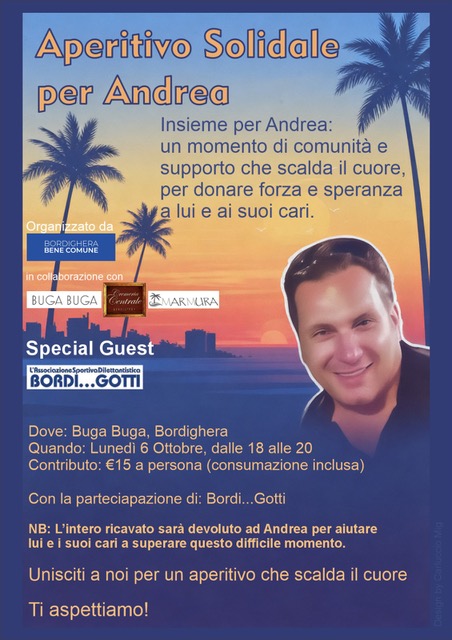 L’Associazione Bordighera Bene Comune rilancia un appello alla generosità e alla partecipazione con l’organizzazione di un aperitivo solidale dedicato ad Andrea Oliva e alla sua famiglia, impegnata in queste settimane a sostenere spese mediche gravose. L’evento, intitolato “Aperitivo solidale per Andrea – Insieme per Andrea”, si terrà lunedì 6 ottobre, dalle 18 alle 20, presso il Buga Buga di Bordighera. Con un contributo di 15 euro (inclusiva la consumazione), tutti sono invitati a partecipare e contribuire alla raccolta fondi.