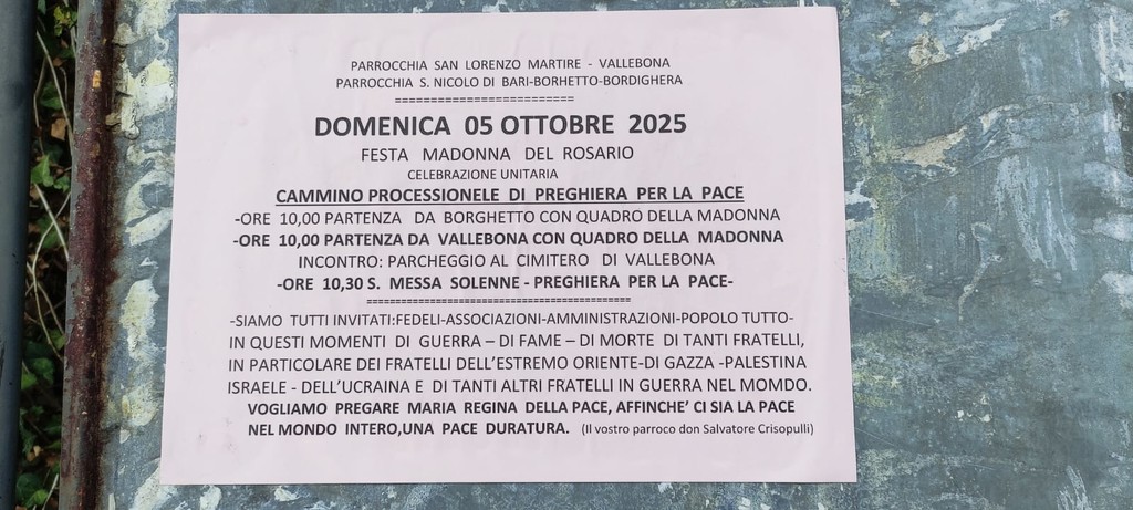 Borghetto San Nicolò e Vallebona celebrano insieme la festa della Madonna del Rosario. Domenica 5 ottobre è, infatti, prevista, una celebrazione unitaria per chiedere la pace nel mondo.