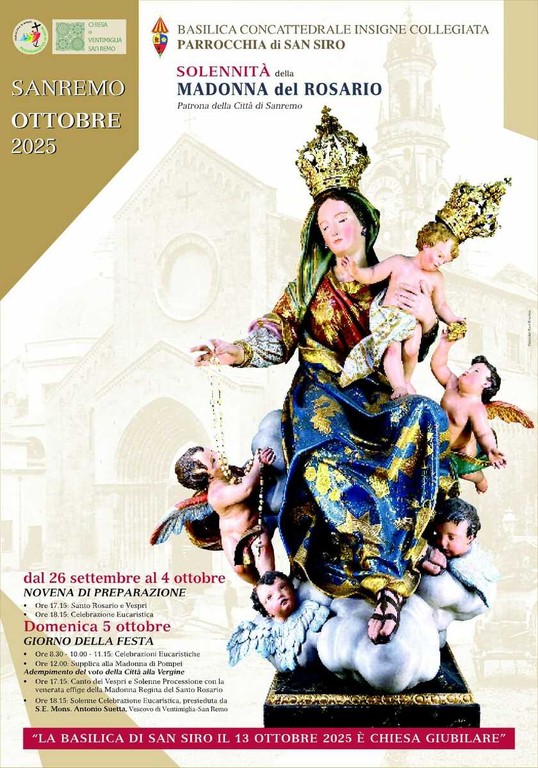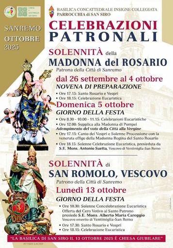 Domenica 5 ottobre, in occasione della festa per la Madonna del Rosario, a San Siro si svolgerà la solenne celebrazione eucaristica presieduta da S.E. monsignor Vescovo Antonio Suetta e preceduta dalla consueta processione per le vie cittadine. Il culto verso la Madonna del Rosario è di antica tradizione e molto sentito non solo a Sanremo, ma nel mondo; alle ore 12 ci sarà la Supplica per l'adempimento del voto della città alla Vergine.