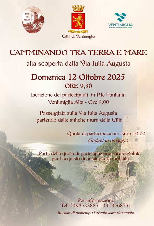 Una piacevole passeggiata alla scoperta della storia e dei paesaggi ventimigliesi a scopo benefico che partirà dalle antiche mura della città di confine. Parte della quota di partecipazione verrà, infatti, devoluta per l'acquisto di ausili per la mobilità.