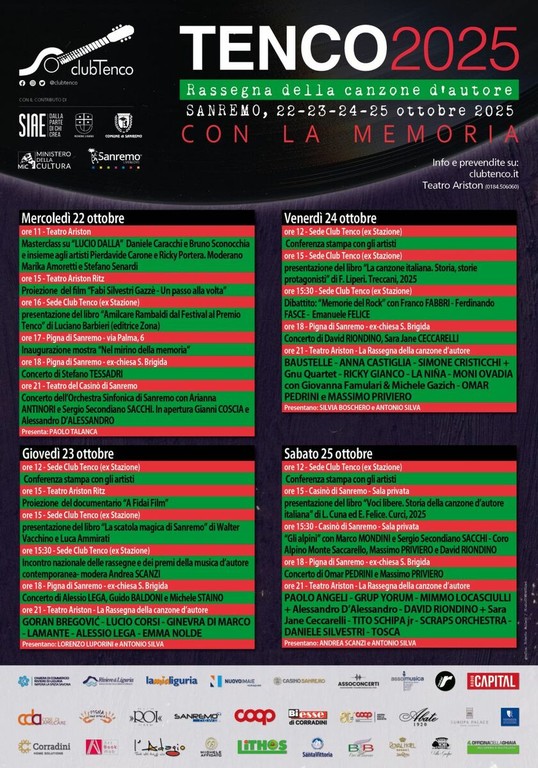 La rassegna comprende infatti nel suo programma, oltre alle tre serate, tanti eventi, proiezioni, presentazioni, incontri e spettacoli pomeridiani, a partire del 22 ottobre in tutta la città simbolo della musica italiana, dalla sede del Club Tenco nell'ex scalo merci della vecchia stazione ferroviaria al Teatro Casinò, dall’Ex chiesa Santa Brigida nel quartiere Pigna al Cinema Ritz.