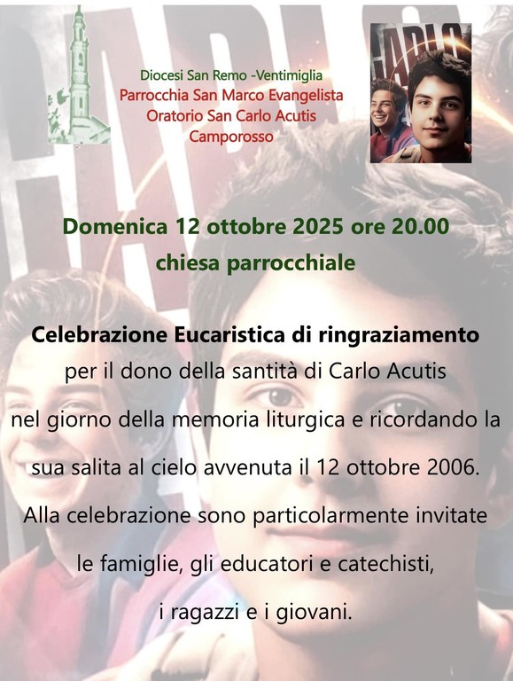 Camporosso in festa per Carlo Acutis. Domenica 12 ottobre alle 20 nella chiesa parrocchiale San Marco Evangelista è prevista una celebrazione eucaristica di ringraziamento per il dono della santità del beato Carlo Acutis, patrono di internet' e primo santo millennial.