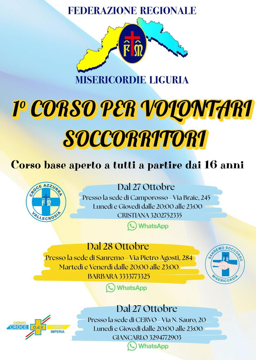 Le Misericordie della Provincia di Imperia annunciano l’avvio di un nuovo corso di formazione per volontari soccorritori, aperto a tutti coloro che desiderano entrare a far parte del mondo socio-sanitario e del soccorso sanitario extra-ospedaliero. L’iniziativa nasce con l’obiettivo di diffondere la formazione in modo capillare su tutto il territorio provinciale, offrendo la possibilità di partecipare al corso nelle sedi delle tre principali aree della provincia: