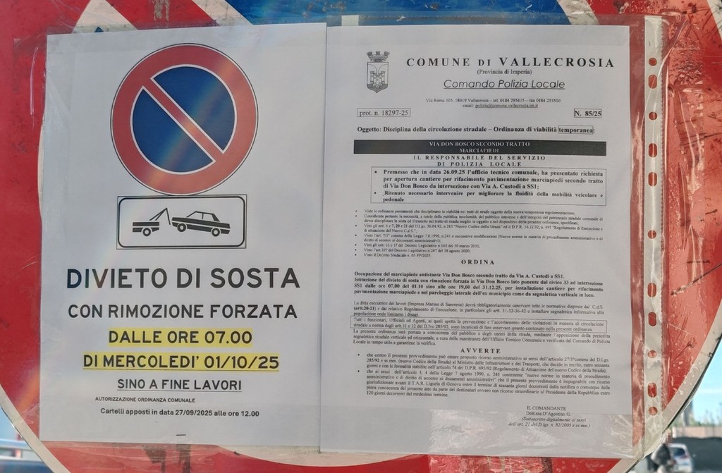 Scatta il divieto di sosta dall'ex Municipio all'intersezione con via Colonnello Aprosio