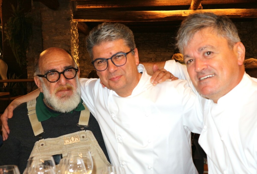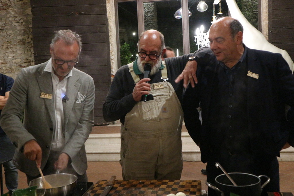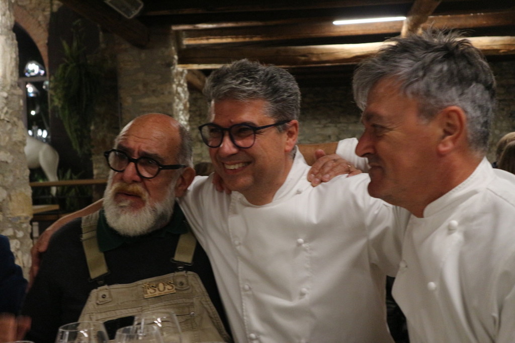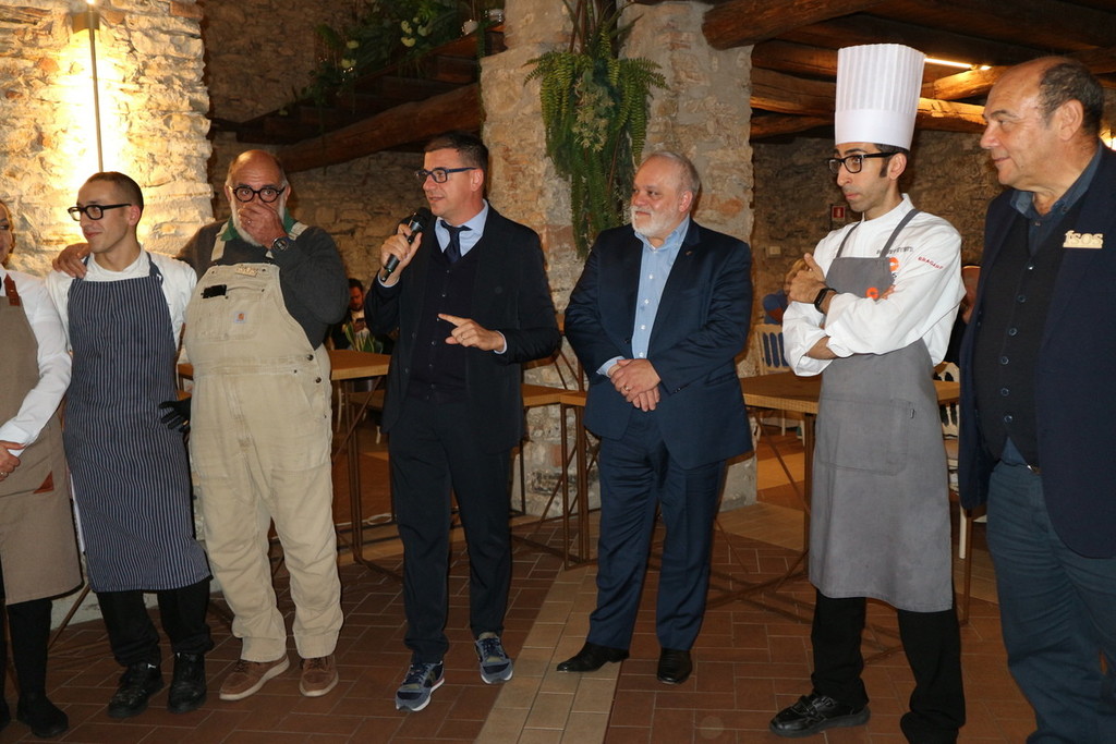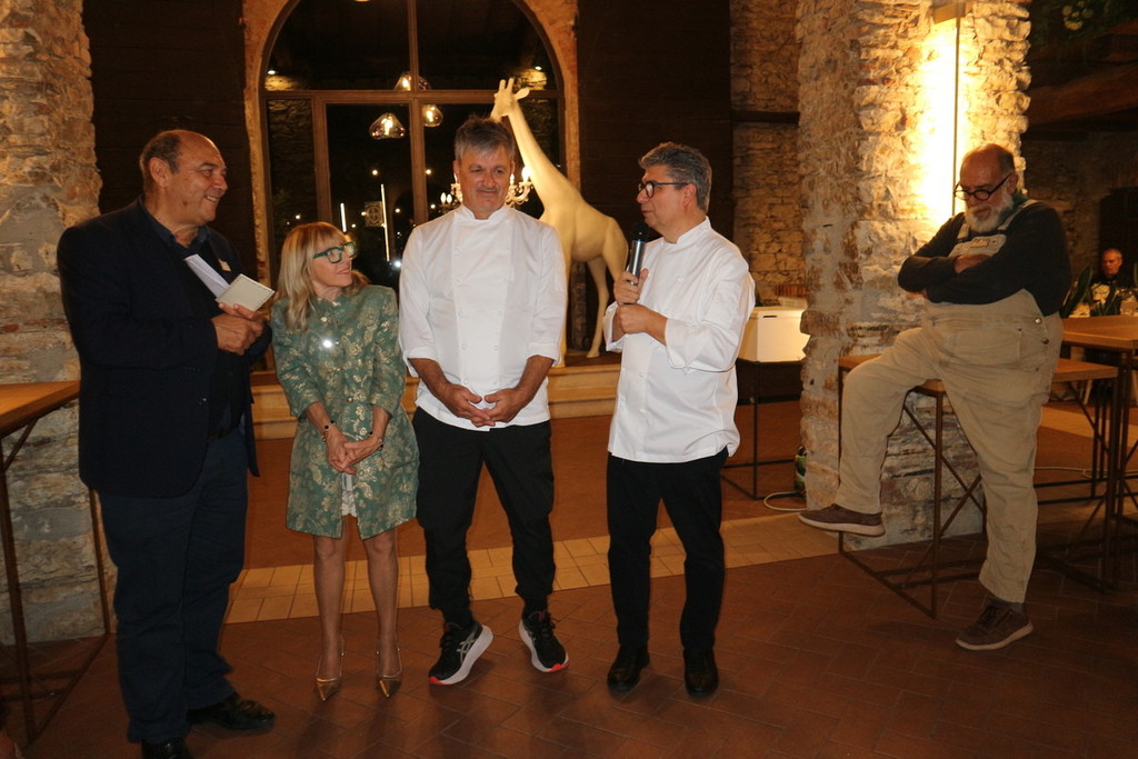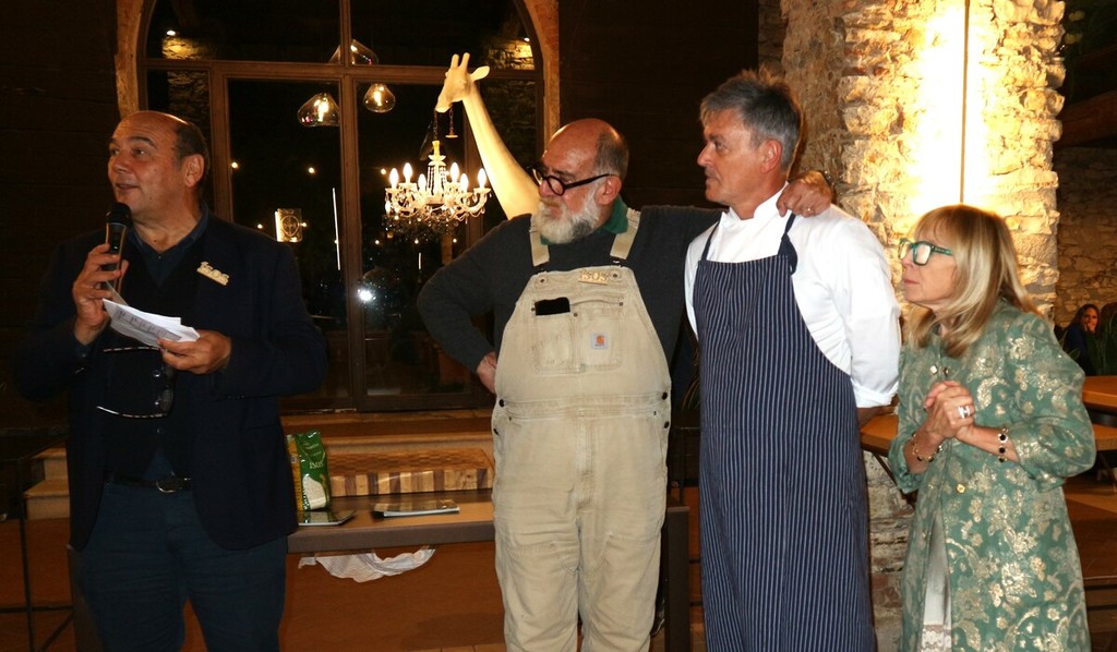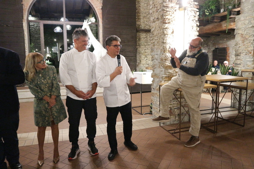 La serata è poi proseguita al Ristorante Carlo Magno di Collebeato, dove Giorgione e suo figlio Beppe hanno affiancato lo chef Beppe Maffioli, padrone di casa, in una straordinaria cena a quattro mani. Il menù, pensato appositamente per l’occasione, ha intrecciato tradizione e creatività, esaltando i sapori e le eccellenze del territorio bresciano.
