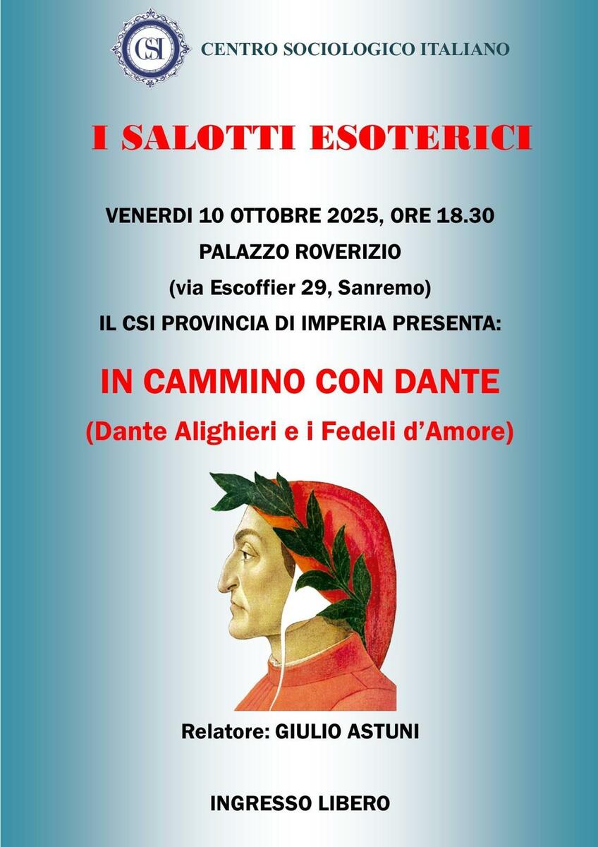 I “Salotti Esoterici” del Centro Sociologico Italiano si confermano dunque un appuntamento di grande valore culturale e simbolico, un luogo di incontro e di confronto per chi desidera approfondire i temi della conoscenza, del pensiero e della spiritualità. Il prossimo appuntamento è dunque fissato per venerdì alle 18.30, a Palazzo Roverizio di Sanremo, per un viaggio “in cammino con Dante” sulle tracce dei misteri della Divina Commedia.