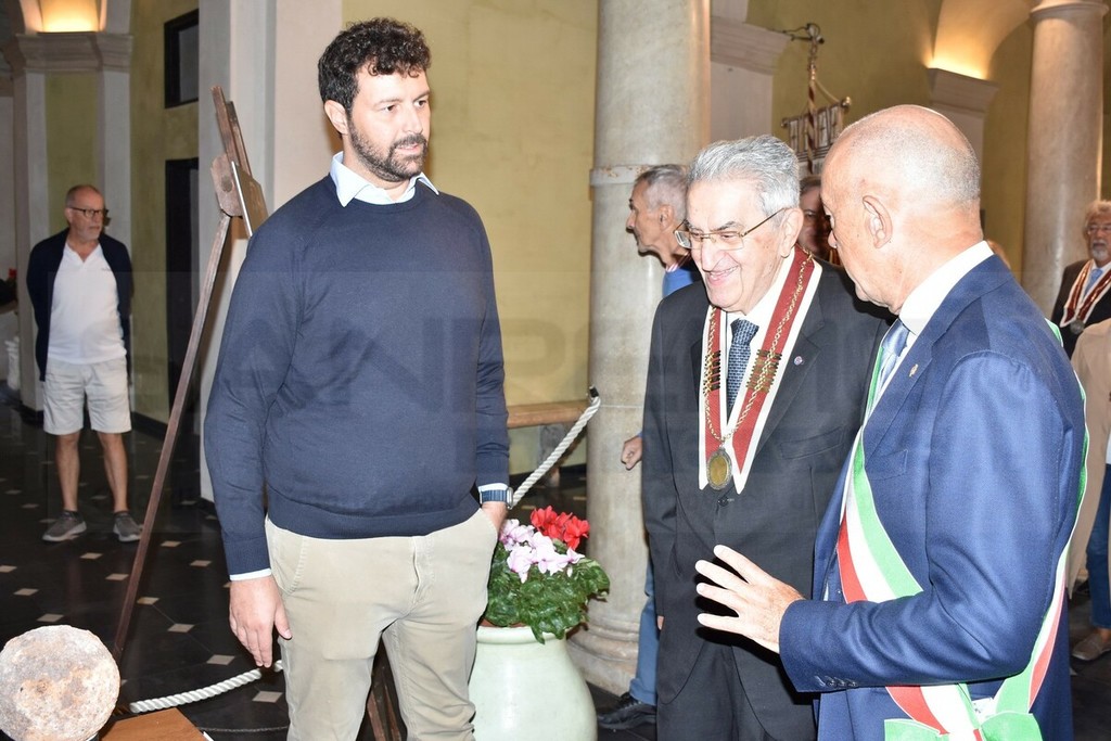 Questa mattina, in occasione della solennità di San Romolo, patrono della città, si è svolta una cerimonia speciale nell’atrio monumentale del Palazzo Borea d’Olmo, alla presenza del sindaco Alessandro Mager, dell’assessore alla Cultura Enza Dedali e dei rappresentanti della Famija Sanremasca. L’evento ha segnato l’apertura ufficiale dell’esposizione dedicata a un ritrovamento eccezionale: una palla di cannone del XVII secolo, dal peso di circa nove chili e dal diametro di tredici centimetri, rinvenuta di recente durante i lavori di restauro dell’ultimo piano del palazzo dai fratelli Tommaso e Corrado Mocenigo Soranzo, discendenti della storica famiglia Borea.