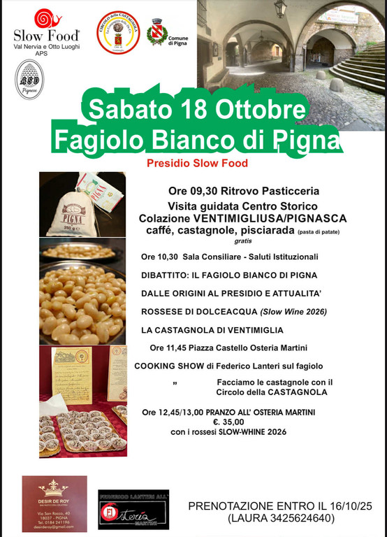 Alle 9.30 è previsto il ritrovo dalla pasticceria per una visita guidata nel centro storico e colazione ventimigliusa-pignasca con caffè, castagnole e pisciarada. Alle 10.30 in sala consiliare, dopo i saluti istituzionali, è previsto un dibattito sul fagiolo bianco di Pigna dalle origini al presidio e attualità con degustazione di Rossese di Dolceacqua, Slow Wine 2026, e della castagnola di Ventimiglia.