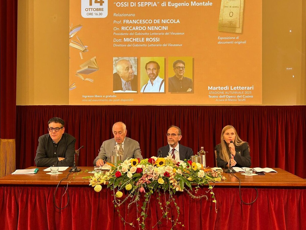 Sul palco sono intervenuti il professor Francesco De Nicola, l’onorevole Riccardo Nencini, presidente del Gabinetto Vieusseux, e il dottor Michele Rossi, direttore dell’istituzione fiorentina. I relatori hanno ripercorso la genesi e l’eredità di Ossi di Seppia, sottolineando il legame di Montale con la Liguria e la modernità del suo linguaggio poetico, capace di coniugare il realismo del paesaggio con l’angoscia esistenziale dell’uomo contemporaneo.