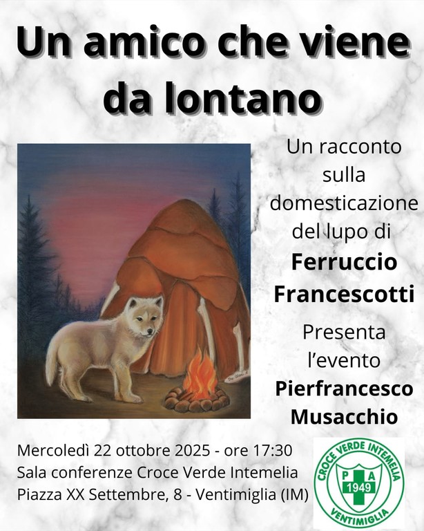 Un racconto sulla domesticazione del lupo sarà al centro dell'incontro che verrà proposto mercoledì 22 ottobre alle 17.30 nella sala conferenze della Croce Verde Intemelia a Ventimiglia. Per l'occasione si terrà, infatti, la presentazione del libro dell’ingegner Ferruccio Francescotti: "Un amico che viene da lontano".