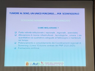 "Per migliorare è necessaria una forte volontà istituzionale, un'allocazione di risorse infrastrutturali, tecnologiche e umane adeguate al fabbisogno e mantenute nel tempo, potenziamento e consolidamento dei coordinamenti regionali di screening e formazione continua" - sottolinea la dottoressa Russo - "Nel 2025 sono previsti in Asl1 Imperiese 10.5000 test. Il ruolo complementare, integrativo alla mammografia aumenta la sensibilità e la specificità dell'imaging radiologico, soprattutto nel seno denso. Esame di prima istanza, invece, nelle donne giovani. La tomosintesi porta un miglioramento del contrasto della lesione, una riduzione sovrapposizione dei tessuti, analisi 3D della lesione e analisi 3D della distribuzione delle microcalcificazioni. La biopsia ecoguidata viene fatta con anestesia locale e ago a scatto per lesione dubbia o sospetta alla Mx o Etg per verificare la benignità o malignità del reperto. La risonanza magnetica precisa la diagnosi di natura della lesione nota, permette di capire la sede, le dimensioni e il numero delle lesioni e una valutazione della mammella controlaterale. E' necessario fare un esame di secondo livello prima di discutere le opzioni terapeutiche".