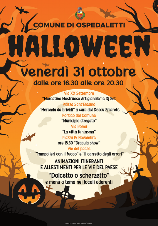 A Ospedaletti, Halloween si svolgerà lungo le strade e le piazze del paese, distribuito su diverse postazioni. E così, sotto il portico del Comune troverà posto il “Municipio stregato”, lungo via Roma “La città fantasma” dove verranno offerti gadget e caramelle ai bambini che raccoglieranno tre timbri di presenza nelle altrettante location, in Piazza IV Novembre dalle h.18,30 “Dracula Show”. Via XX Settembre sarà dedicata al “Mercatino mostruoso artigianale” che sarà affiancato da un dj-set mentre in Piazza Sant'Erasmo i volontari locali del 'Descu Spiaretè' offriranno una “Merenda da brividi” a tutti i presenti. Durante il pomeriggio di festa, lungo le vie del paese sfileranno i “Trampolieri con il fuoco” e lo spaventoso “Carretto degli orrori”, oltre all'immancabile 'Dolcetto o scherzetto' e menù a tema nei locali aderenti.