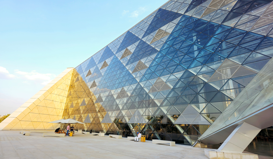 Il design del GEM è di per sé un’opera d’arte. Progettato dallo studio irlandese Heneghan Peng Architects, il museo è costruito in modo che la sua facciata triangolare si allinei perfettamente con le tre Piramidi di Giza, creando una connessione visiva e simbolica tra antico e moderno.