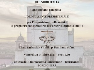 "Pax et bonum". La chiesa dell'Immacolata Concezione, Terrasanta, a Bordighera ospiterà l'ordinazione presbiteriale del diacono Varhatiuk Vitalii, fra' Damino o.f.m. La celebrazione si svolgerà venerdì 31 ottobre alle 10.